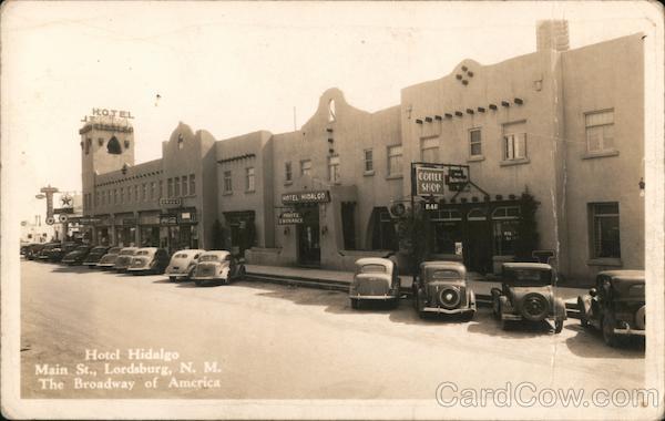 IE COFFEE Budweisen SHOP Drink HOTEL HIDALGO DRUGS BAR GAR PRODUC SIMI MIS НOTEL Coca-Cola PIGGLY WIGGLY ENTRANCE AIR FODL COOLED BARD HID GIT Hotel Hidalgo Main St., Lordsburg, N. M. The Broadway of America