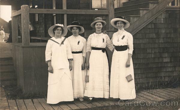 Four women in white with ribbon pins on blouses on a boardwalk
