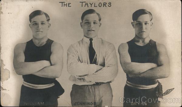 Front: THE TAYLORS WILLIAM JENNINGS HOBIGR BRYAN Back: un Famous Taylor Triplets : WORLD'S CLEVEREST BOY BOXERS WEST SOMERVILLE, MASS. THOBICK PROCESS,