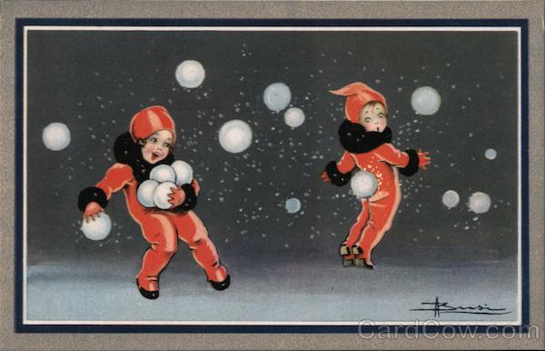Two children, dressed in red and black, throwing snowballs