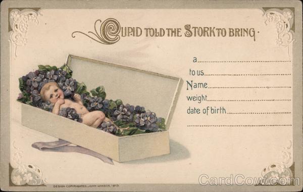Front: UPID TOLD THE STORKTO BRING · a... to us.. Name... weight.. date of birth DESION COPYRIGHTED,JOHN WINSCH, 1913. Back: 35 P Р DODOD 2018 ON THIS SIDE.