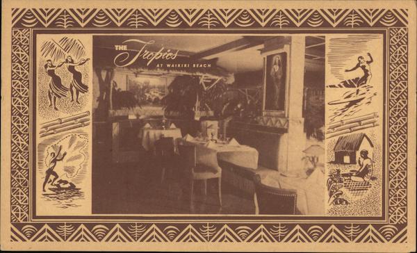 frfpes POSTAGE THE STAMP HERE The unusual and attractive Lanai Room of Waikiki's popular restaurant, The Tropics, across from the Royal Hawaiian Hotel, Honolulu, T. H.