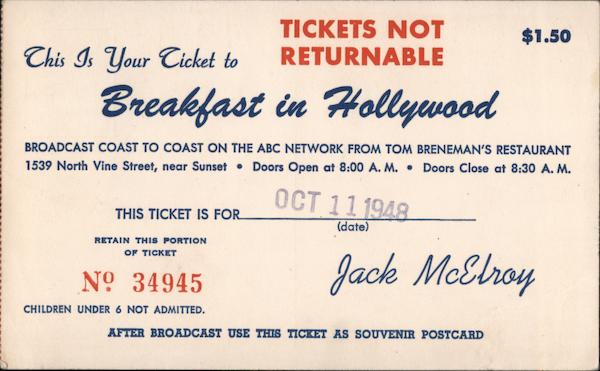 $1.50- Broadcast coast to coast on the ABC network from Tom Breneman's Restaurant, 1539 North Vine Street, near Sunset. Doors open at 8:00 a.m. - Doors close at 8:30 a.m. This ticket for Oct. 11, 1948. ~Jack McElroy.