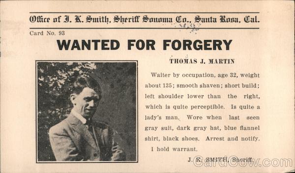"Thomas J. Martin. Waiter by occupation, age 32, weight about 135; smooth shaven; short build; left shoulder lower than right, which is quite perceptible. Is quite a lady's man. Wore when last seen gray suit, dark gray hat, blue flannel shirt, black shoes. Arrest and notify. I hold warrant. J.K. Smith, Sheriff." From the Darlene Thorne Collection |