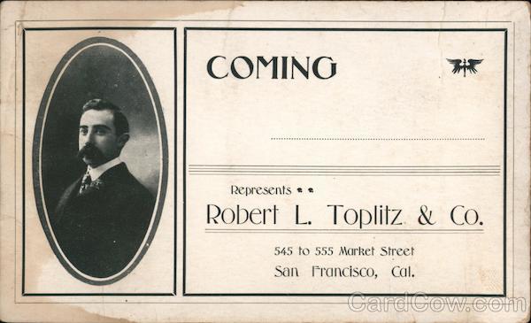 Front: COMING Represents e a Robert L. Toplitz & Co. 545 to 555 Market Street San Francisco, Cal. Back: POST CARD Soo
