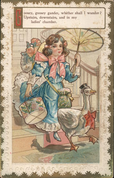 Front: ock-a-doodle-doo, my dame has lost her shoe, My Master lost his fiddle-stick, And don't know what to do. Back: POST CARD. PLACE POSTAGE STAMP HERE. FOR CORRESPONDENCE FOR ADDRESS ONLY