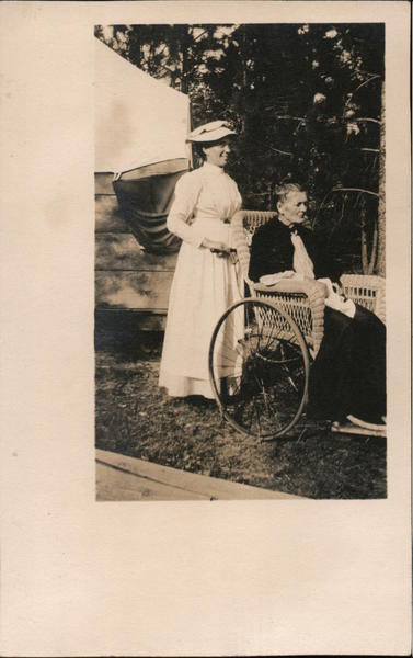 Young woman stands behind wheelchair of older woman