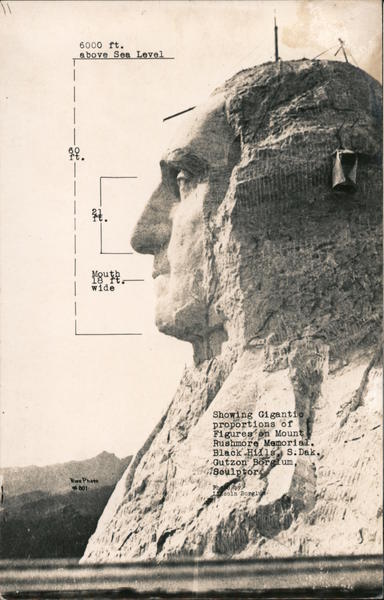 Front: 6000 ft. above Sea Level ft. Mouth 18 ft. wide Showing Gigantic proportions of Figures on Mount Rushmore Memorial. Black Hills S.Dak. Gutzon Borglum, Soulptor Rise Photo #801 Pho oby Lcoln Borglum Back: PHOTO POST CARO - Kodak PLAC Pape