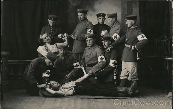 Group of Men in Red Cross uniforms, with a patient on a mat