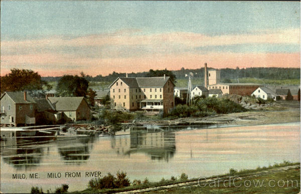 Front: MILO, ME. MILO FROM RIVER. Back: THE HUGH C. LEIGHTON CO., MANUFACTURERS, PORTLAND, ME., U.S.A. 25035 MESSAGE MAY BE WRITTEN ON THIS SIDE. land Island Possessions Cuba, Canada and For Foreign.