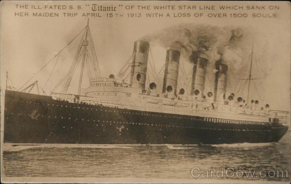 Front: THE ILL-FATED S. S. "Titanic " OF THE WHITE STAR LINE WWHICH SANK ON HER MAIDEN TRIP APRIL 15 TH 1912 WITH A LOSS OF OVER 1500 SOULS 99 Back: 200 A 20A N 0 & A 3