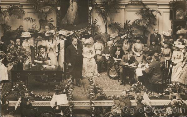 Appears to be a theatre stage with an orchestra. Men and women in fancy hats. Panama-Pacific Exposition visit.