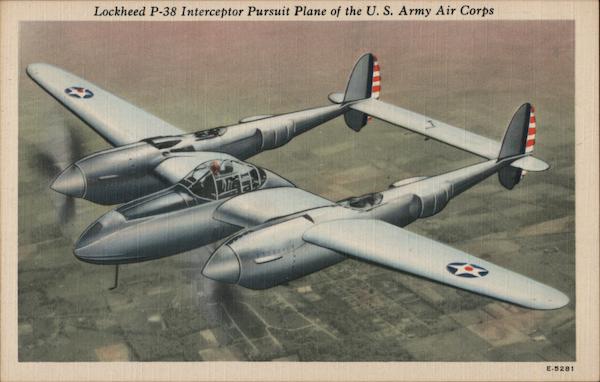 Front: Lockheed P-38 Interceptor Pursuit Plane of the U. S. Army Air Corps E-5281 Back: This interceptor pursuit plane can develop a phenomenal speed of well over 400 M.P.H. and can be used as an escort fighter-plane. “Keep 'Em Flying"