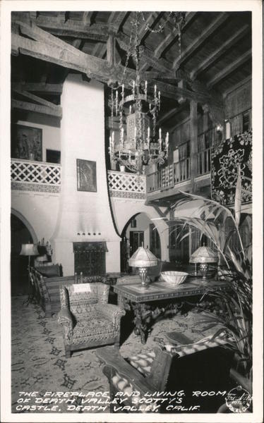 Front: THE FIRPEPLACE AND LIVING. ROOM, OF DEATH VALLEY SCOTTY'S CASTLE, DEATH VALLEY, CALIF. POTLS CALE Back: PUBLISHED BY FRASHERS, INC., POMONA, CALIF.