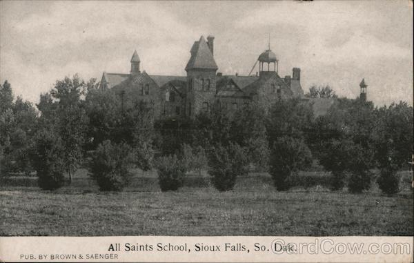 Front: All Saints School, Sioux Falls, So. Dak. PUB. BY BROWN & SAENGER Back: 20 Dost Card. PLACE STAMP HERE. DOMESTIC: ONE CENT. THIS SIDE IS FOR THE ADDRESS ONLY. FOREIGN: Two CENTS.