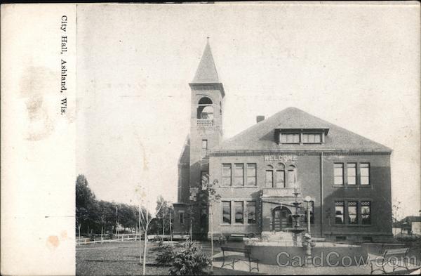 Front: HELCOME City Hall, Ashland, Wis. Back: st Card PLACE STAMP THE ADDRESS ONLY TO BE THIS SPACE MAY BE USED HERE WRITTEN HERE FOR COMMUNICATION.