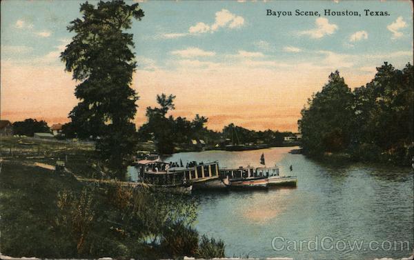 Front: Bayou Scene, Houston, Texas. Back: PoST CARD 8PM IDE ADDRESS ONEY ON LRAM oreigh. MESSAGE MAY BSWRITTEN ON THIS SIDE. man CC. Trucson 24 GeT 31 ECEIVED A-17700 U.S.POSTAGE AHame hen gmy nence9 7ne anel Encouagement amd at hes