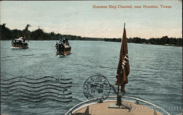 Front: Houston Ship Channel, near Houston, Texas O0 404195 Back: urAMOUS U.SPOSTAGE ONS onorian JUL 6 4PM TTHE WOR ONE G N ess Onb han atd aya R2 alellarn1917-3aen Aea callmm are a an 47