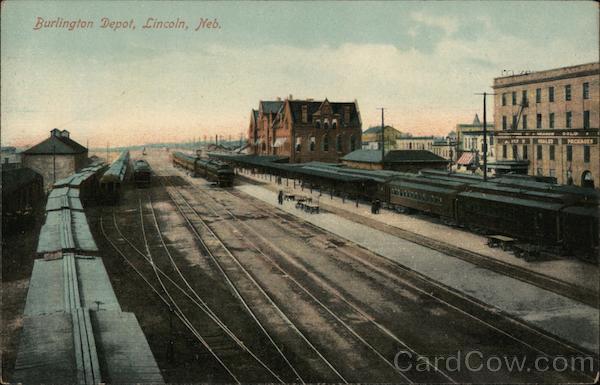 Front: Burlington Depot, Cincoln, Neb. OLD MEAROW 0 PACKAGES SEALED Back: THIS SPACE FOR WRITING MESSAGES PLACE POST CARD STAMP HERE DOMESTIC ONE CENT FOREIGN TWO CENTS THIS SPACE FOR ADDRESS ONLY 252.-809 MADE IN GERMANY