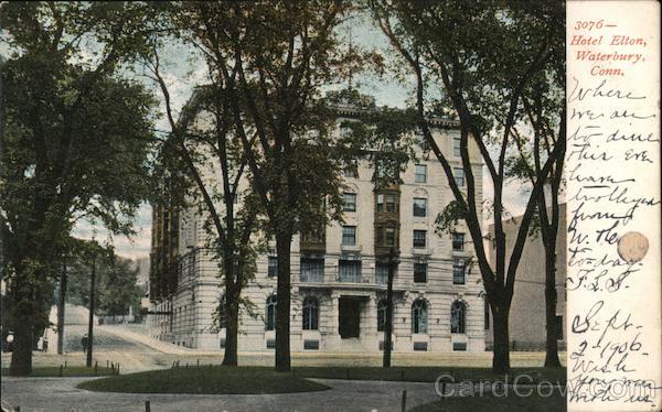 Front: 3076– Hotel Elton, Waterbury, Conn. Where meran o dine is era ollege . Then Septy 906 Back: TUNITED STATES SEP u 1130... 1906 INRAN 1790 1706 FRANT CONN Sus , a TSmith Dowódaru 1545 Chapel St. Coun