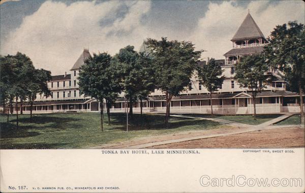 Front: WARE VA TONKA BAY HOTEL, LAKE MINNETONKA. COPYRIGHT 1904, SWEET BROS. No. 187. v. 0. HAMMON PUB. Co., MINNEAPOLIS AND CHICAGO. Back: FOREIGN, TWO CENTS.