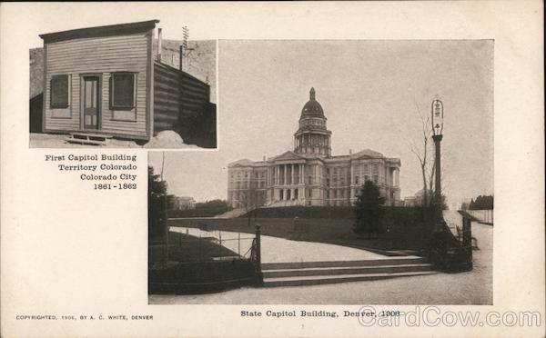 Front: AU, 888888 First Capitol Building Territory Colorado Colorado City 1861-1862 State Capitol Building, Denver, 1906 COPYRIGHTED, 1906, BY A. C. WHITE, DENVER Back: zda Mis Zecif. Crubelin bratisville, Chester Oro Va.