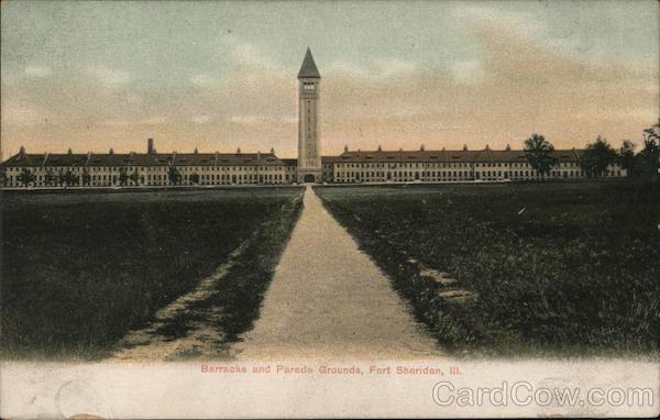 Front: ROB0 MED Barracks and Parade Grounds, Fort Sheridan, II. Back: LEIPZIG BERLIN DRESDEN umo ruments LITHO-CHROMEO TRADE-MARK ORDER N°10733 United States and Island Possessions, Cuba, Canada and For all other Countries 89026