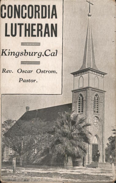 Front: CONCORDIA LUTHERAN Kingsburg.Cal Rev. Oscar Ostrom, Pastor Back: U.S.POSTAGE HCSEN 1909 UN 4- ONE CENT POST CARD maud Cal artll ear uind ueta eand heu isoumerhat tue aune nidhe. Beat ugada ti all a
