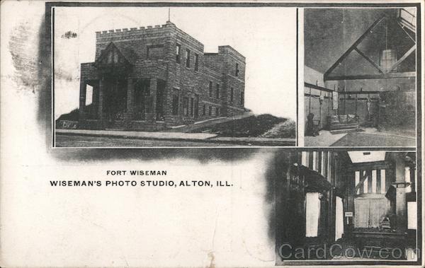Front: FORT WISEMAN WISEMAN'S PHOTO STUDIO, ALTON, ILL Back: POST CARDLON U.S.POSTAGE APRI9 PM 19-1910 LL a lith a Vra thue Ivad Cltag a This Space for Correspondence This Space for Address