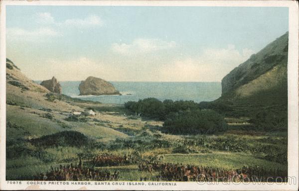 Front: 70875 COCHES PRIETOS HARBOR, SANTA CRUZ ISLAND, CALIFORNIA Back: PLACE STAMP POST CARD HERE re "PHOSTINT" 99 PAT OFF TRADE MARK co U MADE ONLY BY DETROIT PUBLISHING CO. 4 THIS SPACE MAY BE USED FOR MESSAGE THIS SPACE FOR THE ADDRESS