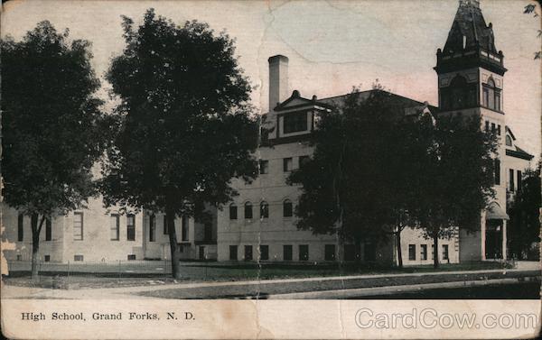Front: High School, Grand Forks, N. D. Back: Post Card 2- PLACE SBOR L THE ADDRESS THIS SPACE MAY BE USED STAMP FOR COMMUNICATION APR WRITTEN HERE. HERE 7 PM 1908 K. D. Treelon a. Hed