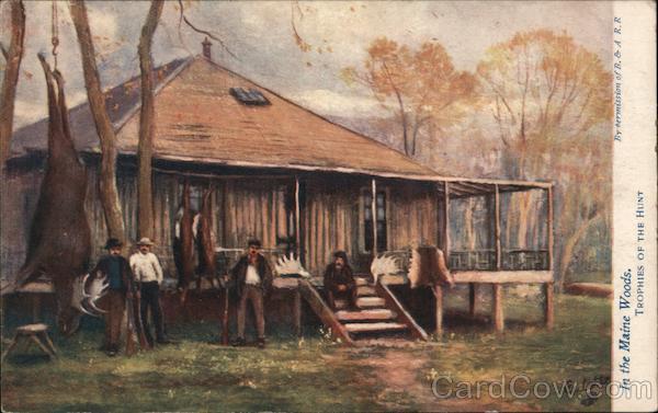 With a gameland something like 15,000 square miles in extent, and with thousands of moose and deer wandering over the mountains and valleys, it is not surprising that sportsmen proclaim northern Maine the greatest hunting-ground in America. There are still many runways of wild game seldom touched by foot of man, so that to-day, as in years long gone by, the monarch moose and nimble, graceful deer hold undisputed sway. In The Maine Woods - A Good Shot The hunting of moose is one of the chief attractions to the sportsman who spends his vacation in the forests of Maine. No person, however, is allowed by law to catch or destroy any moose until it be at least one year old, and then he is permitted to kill but one bull moose in the season which extends from October 15th to December 1st. In the Maine Woods Breakfast in Camp In the Maine Woods Trophies of the Hung |