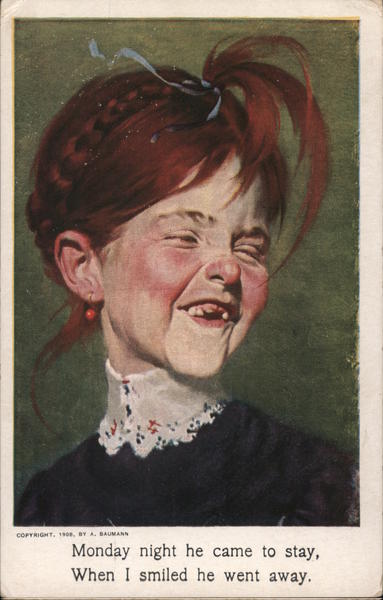 Front: COPYRIGHT, 1908, BY A. BAUMANN Thursday evening he called me a daisy, Then rushed away as if he were crazy Back: POST CARD Stamp Here THIS S PACE FOR COMMUNICATION ADDRESS ONLY Printed in U. S. A.