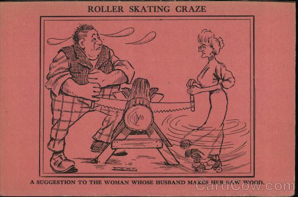 Front: ROLLER SKATING CRAZE fai FAAL A SUGGESTION TO THE WOMAN WHOSE HUSBAND MAKES HER SAW WOOD. Back: PLACE STAMP HERE POST CARD UNITED STATES AND CANADA ONE CENT FOREIGN, TWO CENTS This space may be used for Writing This space for Address only