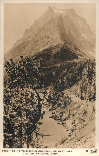 Front: 3020 GOING-TO-THE-SUN MOUNTAIN, ST. MARY LAKE GLACIER NATIONAL PARK Back: A Zo POST CARD PLACE STAMP NO HERE ADDRESS CORRESPONDENCE 2 o A AZ NO 0