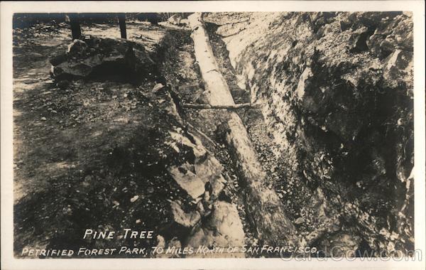Front: PINE TREE PETRIFIED FOREST PARK; 70 MILES NO TH OF SAN FRANCISCO Back: a POST CARD A ZO A PLACE A z STAMP HERE AERESS VA Z CORRESPONDENCE 4<N 0 0 P