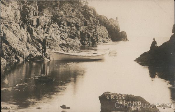Men standing near small boat, Cross Island