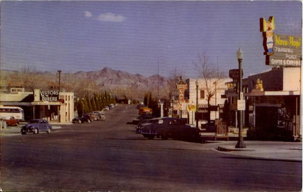 Arizona Street looking from the intersection of Nevada Highway gives an excellent impression of this thriving community. Built by the Bureau of Reclamation to house the Hoover (Boulder) Dam workmen, this town has became a modern oasis in the desert. |