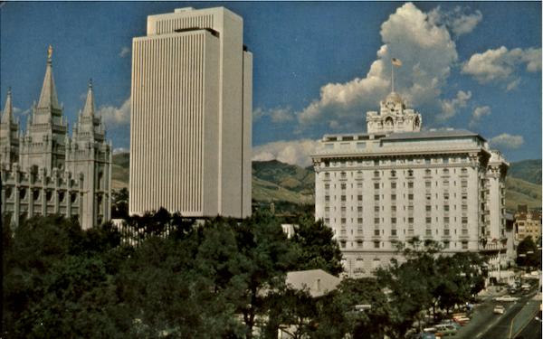 | Located in the center of Salt Lake City, this world famous hotel offers the visitor an unexcelled view of historic Temple Square (far right of picture) and the World Headquarters Building of the Church of Jesus Christ of Latter-day Saints (center of picture). |