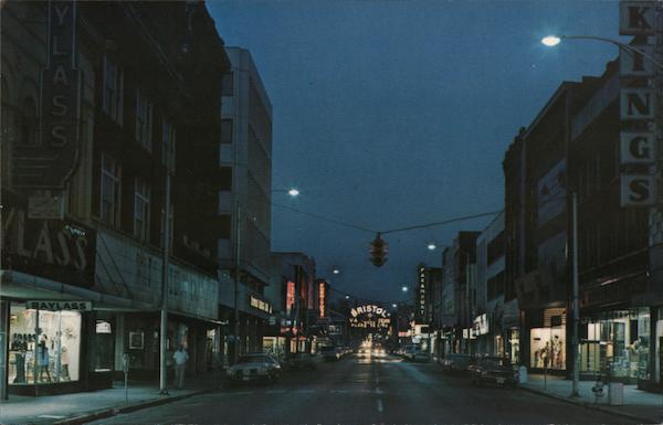 Front: Ki LASS BRISTOL PLADI RAYLASS LNGS aRAIONT S S Back: Bristol, Tenn. - Va. State Lines separating the Twin-City on the famous State Street, downtown. PLACE STAMP HERE POST CARD Address 148379 Color by Woodys House of Portraits