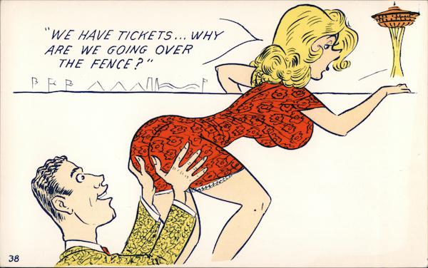 Front: "WE HAVE TICHETS... WHY ARE WE GOING OVER THE FENCE ? PEP 38 Back: FAIR COMIC CARD STAMP HERE C.P.JOHNSTON CO SEATTLE, WASH.