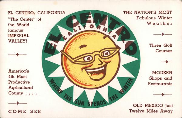 El Centro, Califorinia "The Center" of the World famous Imperial Valley America's 4th Most Productive Agricultural County The Nation's Most Fabulous Winter Weather Three Golf Courses Modern Shops and Restaurants Old Mexico just Twelve Miles Away