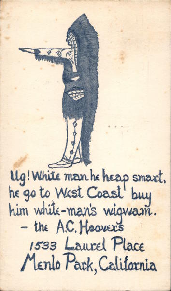 Front: ua!White man he heap smact, he ao to West Coasi' buy him white-man's wiqwaat. 'uren the AC.Heoves I533 Laurel Place Menlo Park, Calitornia Back: yso PRAY FOR PEACE ENLO SEP 21 4-PM 1960 CALIF ne Shawman 22/2 www PARK 7N3