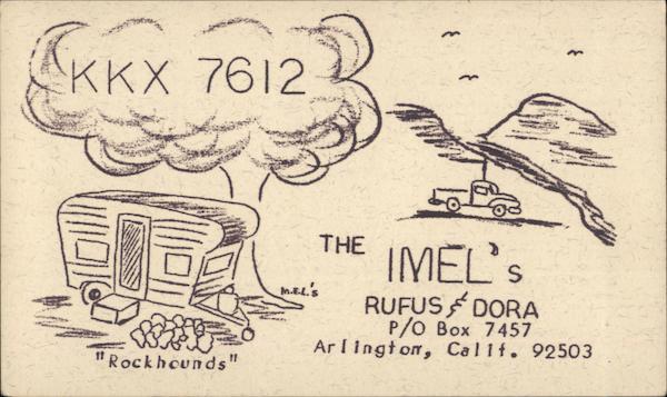 Front: KKX 7612 THE IMEL's h.EL.'S RUFUS DORA P/O Box 7457 Ar Iingtom, Calif. 92503 11 Rockhounds" f * Back: confirming QSC H1 3- 19 at st on mobile was base. Your sign al was r eceived on channel Remarks: 73's Pse QSL Have card Tnx ia hmy 97