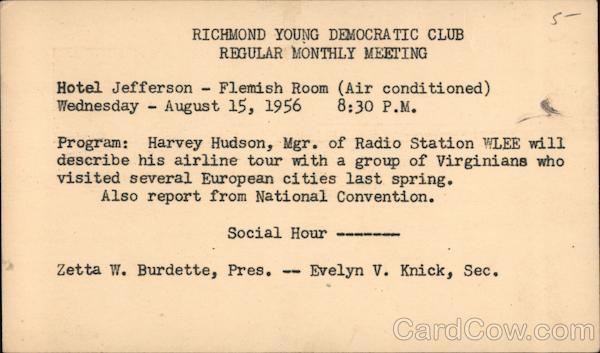 Hotel Jefferson - Flemish Room (Air conditioned). Wednesday - August 15, 1956. Program: Harvey Hudson, Mgr. of Radio Station WLEE will describe his airline tour with a group of Virginians who visited several European cities last spring. Zetta W. Burdette, Pres. - Evelyn V Knick, Sec. From the Darlene Thorne Collection |