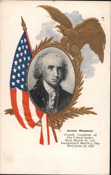 Front: JAMES MADISON Fourth President of The nited States Born March 16, 1751 Inaugurated March 4, 18o9 Died June 28, 1836 Back: 672-44 10eo PLACE STAMP HERE. POST CARD UNITED STATES AND CANADA ONE CENT. FOREIGN, Two CENTS. THIS SIDE FOR THE ADDRESS