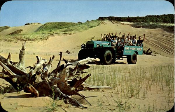 | The Scenic Dune Ride between Goshorn Lake and Lake Michigan passes through some of the most interesting scenery in West Michigan. Dunewood Stumps in the foreground are sand-blown into grotesque shapes. Even a once thriving city lies buried under the shifting sands |
