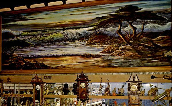 On view at HARBOR HOUSE GIFTS Old Fisherman's Wharf, Monterey, California, 93940 Largest known Cypress and Sea oil on canvas - by Richard Hamilton. 23 feet long by 8 feet high. SC12031 COLOR BY MIKE ROBERTS BERKELEY, CALIF. 94710 U.S.A.