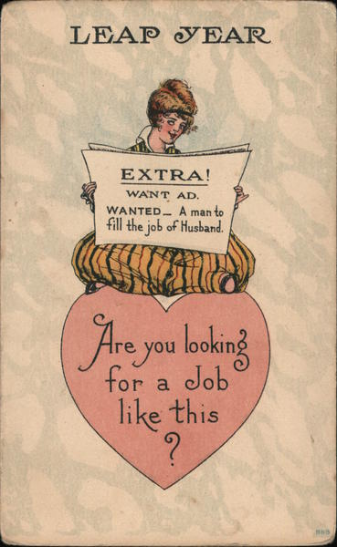 Front: LEAP EAR ΕXTRA! WANT AD. WANTED fill the job of Husband. A man to Are you loaking for Job like this ? 886 Back: POŚT ST CARD This side for Address This side for Correspondence MADE IN U $.A.