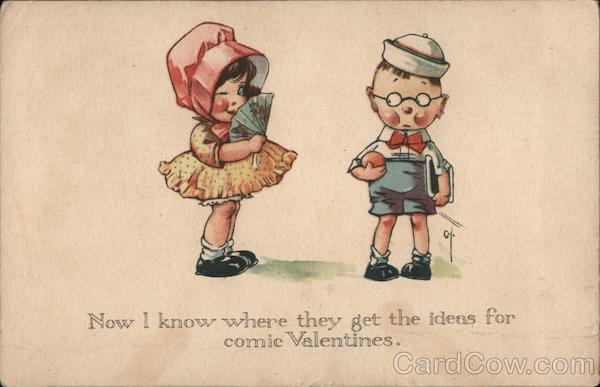 Front: Now I know where they get the ideas for comic Valentines. Back: POST CARD PLACE POSTAGE STAMP THIS SIDE FOR CORRESPONDENCE. THE ADDRESS TO BE WRITTEN HERE ON THIS SIDE a Msaalda Pale Sram Ella 650 MADE IN U. S. A